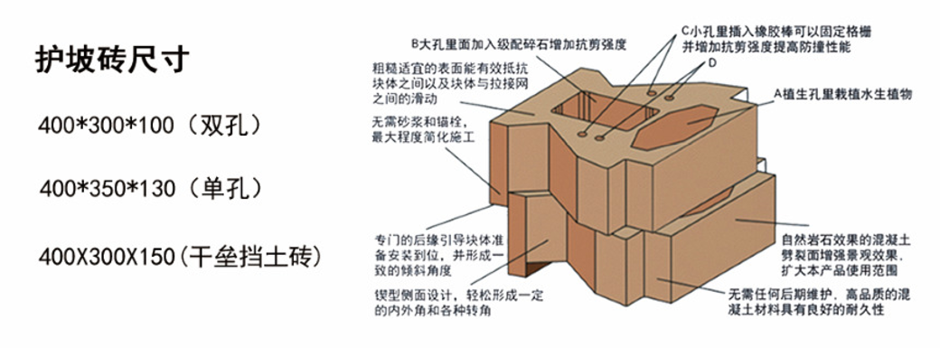 单孔水利护坡砖 发布时间:2019-01-17 11:47 瑞图公司水利护坡系列产品,品种繁多规格齐全、强度稳定,耐磨与耐久性强、透水透气、防滑、色彩鲜艳、组合随意,铺设简单,其独特的连锁设计可以保证整体性适用于各种护坡。